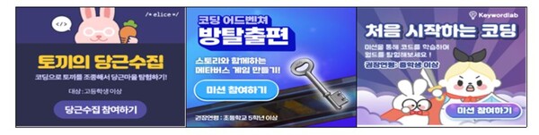 ❷ 텍스트 코딩 부문은 컴퓨터언어에 관심 있는 초등학교 고학년부터 체험하기에 적합하며, ‘토끼의 당근수집’, ‘코딩 어드벤처 방 탈출편’, ‘처음 시작하는 코딩’ 3개의 프로그램을 마련하였다.